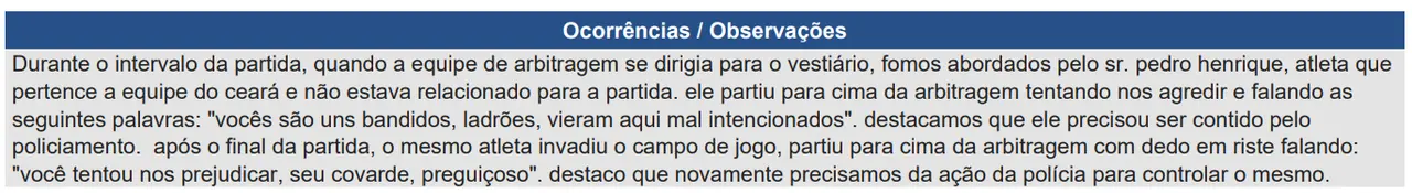"Durante o intervalo da partida, quando a equipe de arbitragem se dirigia para o vestiário, fomos abordados pelo sr. Pedro Henrique, atleta que pertence a equipe do Ceará e não estava relacionado para a partida. ele partiu para cima da arbitragem tentando nos agredir e falando as seguintes palavras: "vocês são uns bandidos, ladrões, vieram aqui mal intencionados". destacamos que ele precisou ser contido pelo policiamento. Após o final da partida, o mesmo atleta invadiu o campo de jogo, partiu para cima da arbitragem com dedo em riste falando: "você tentou nos prejudicar, seu covarde, preguiçoso". destaco que novamente precisamos da ação da polícia para controlar o mesmo."