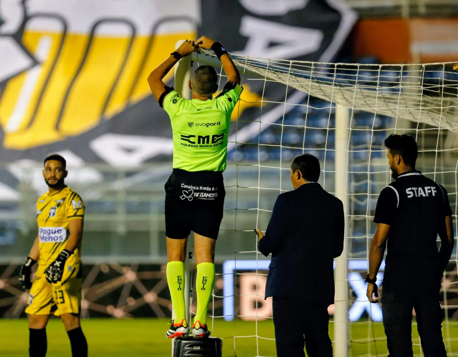 O árbitro utilizou um banquinho de plástico para alcançar o defeito na rede, que tinha um buraco no canto esquerdo superior, rente ao ângulo da trave. Ele improvisou e utilizou o material da própria rede para amarrar e consertar o espaço.