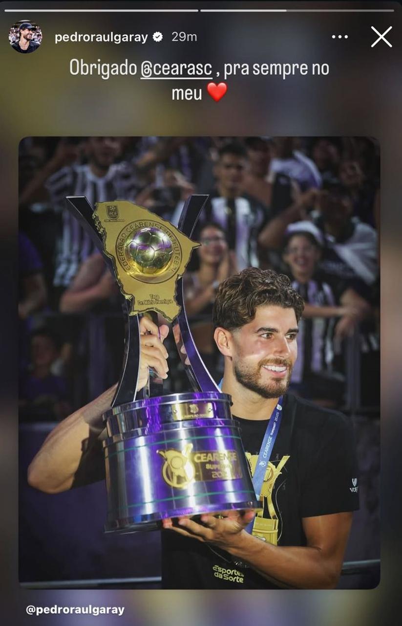 O atacante Pedro Raul se despediu do Ceará em suas redes sociais nesta quarta-feira (31). Ele postou uma imagem com a taça do Campeonato Cearense de 2025 e uma frase: "Obrigado Ceará, pra sempre no meu coração".