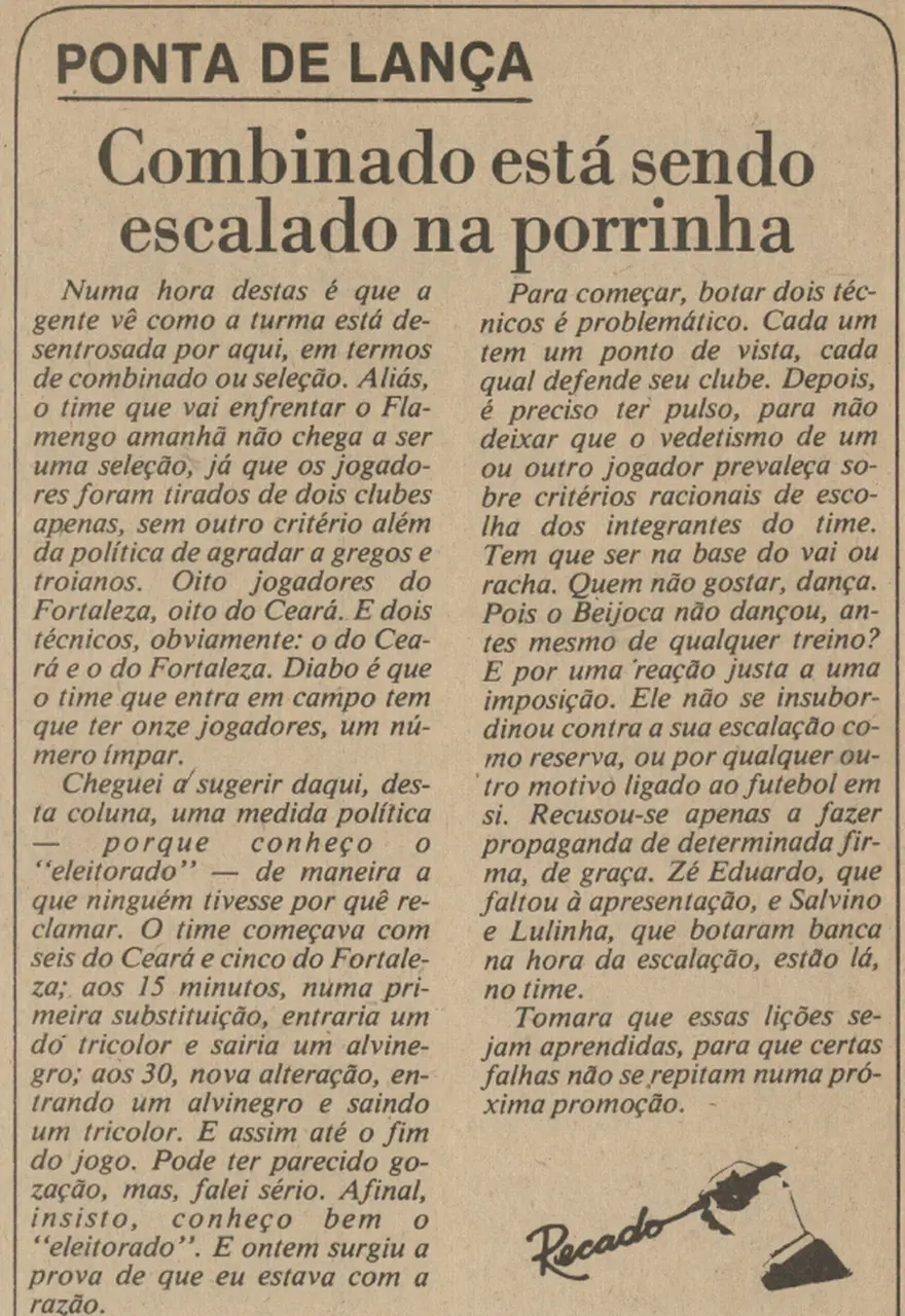 Halmalo Silva, do Diário do Nordeste, criticou na coluna Ponta de Lança que o combinado estava sendo escalado na "porrinha", ou seja, na sorte, ou de qualquer jeito.
