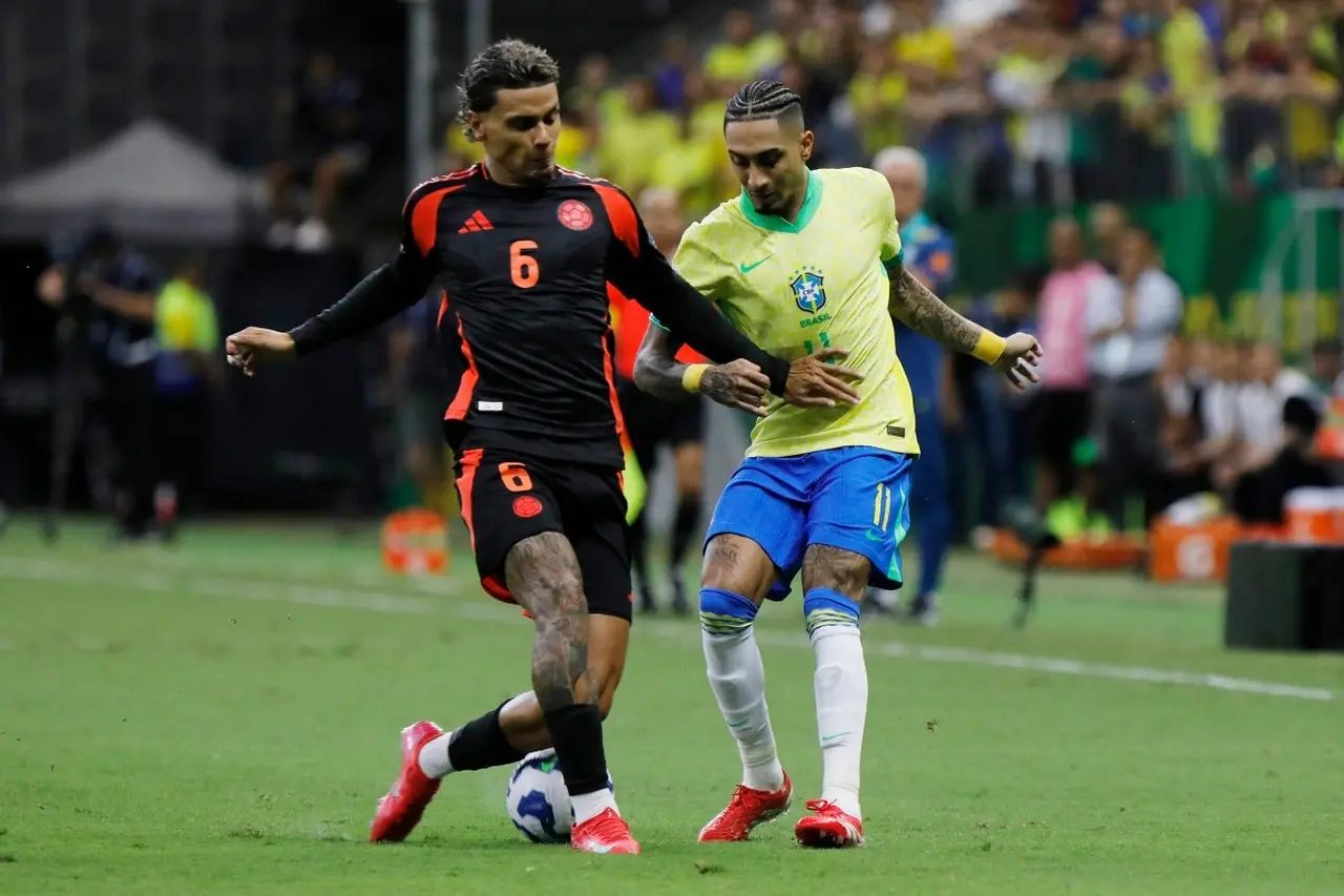 O Brasil começou a partida em ritmo intenso, pressionando a Colômbia. E logo aos 4 minutos, Muñoz derrubou Vini Jr dentro da área e o pênalti para o Brasil foi marcado. Raphinha bateu bem e abriu o placar: 1 a 0.