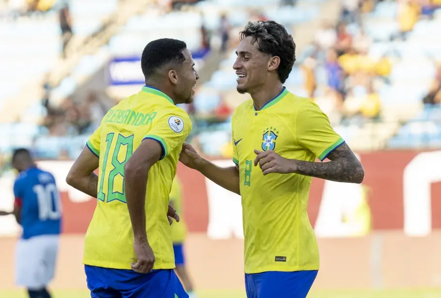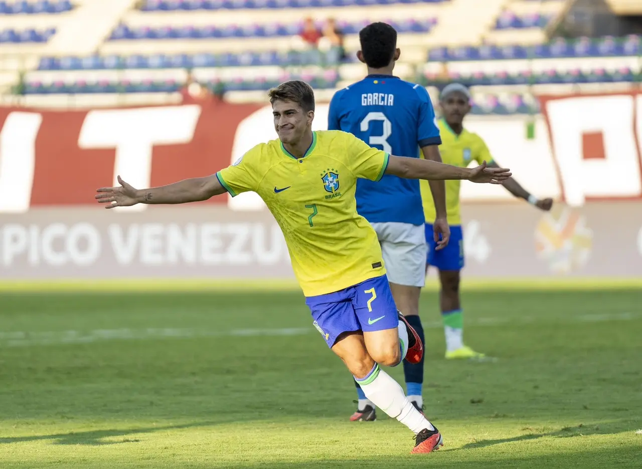 Aos 19 minutos, Endrick fez boa jogada dentro da área e cruzou para Marlon Gomes, livre, empatar o placar para o Brasil.
