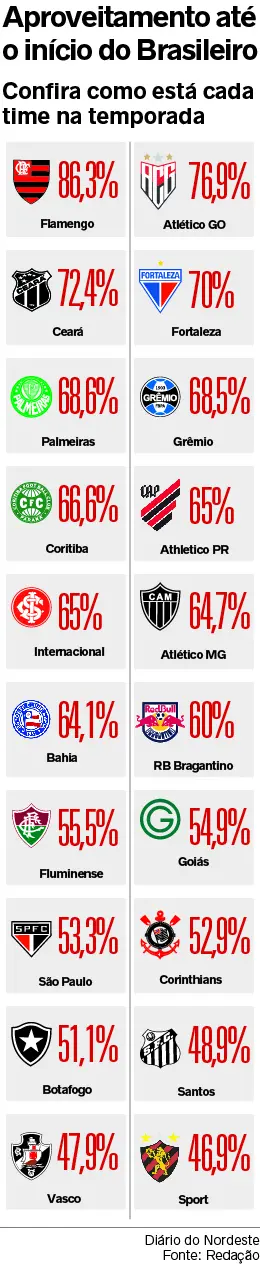 Os demais espaços da tabela são sazonais. Há quem esteja contente com vaga na Copa Sul-Americana, o caso do trio nordestino formado por Bahia, Ceará e Fortaleza. Outros tratam o G-10 como aceitável dentro do projeto, como Corinthians, Santos e RB Bragantino.