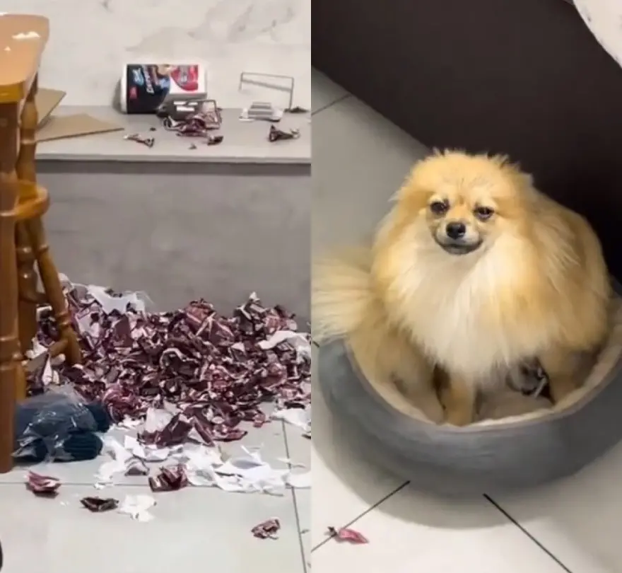 O casal de empresários tomou aquele susto ao chegar em casa e ver os itens espalhados pela sala. Ted, o cachorro de um ano e três meses, teria alcançado a mesa onde o material estava guardado em uma sacola.