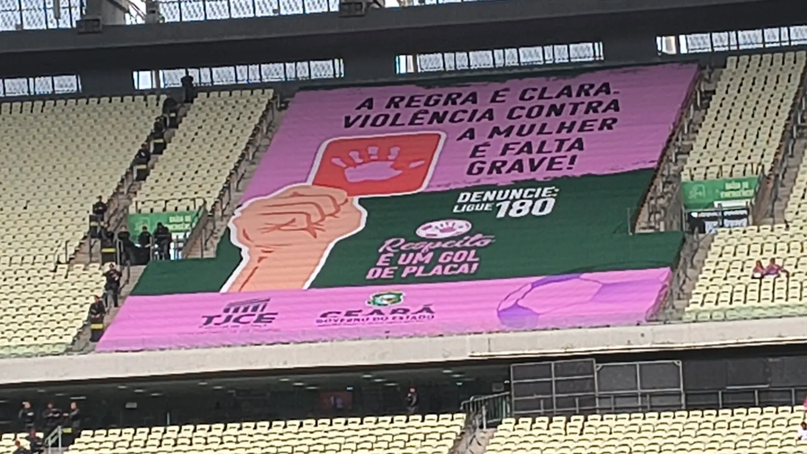 A campanha “Respeito é um Gol de Placa” ganhou o campo da Arena Castelão neste domingo (8), Dia Internacional da Mulher. Uma ação envolvendo o VAR da partida entre Ceará e Fortaleza, na final do Campeonato Cearense, chamou atenção para a importância da segurança do público feminino nos estádios de futebol. Além de uma mensagem no telão, uma lona com mensagem relativa ao tema foi estendida na arquibancada. A iniciativa é do Tribunal de Justiça do Ceará, com apoio de diversos órgãos, da FCF e dos clubes.