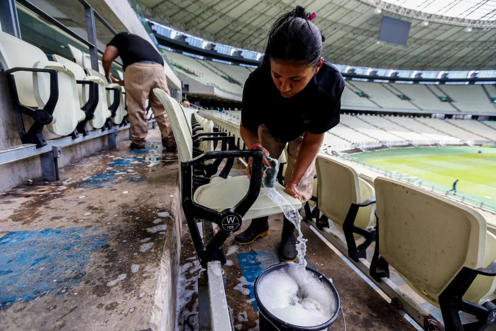Outra etapa importante e complexa é a lavagem das 63 mil cadeiras, que ocorre periodicamente. Além do número alto de assentos, a atividade é feita manualmente pelos funcionários. A logística de deslocamento, além de material e equipamento é complicada. Francisca Maria, conhecida por Marissol, trabalha no Castelão desde a época da Copa do Mundo. "Do banheiro ao teto", ela é uma das que se dedica à atividade. Debaixo do sol, ela faz um trabalho que muita gente não percebe ou valoriza.