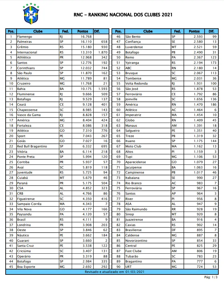 O Flamengo somou 16.768 pontos no total, contra 16.110 do Palmeiras. Fecham o Top-5, Grêmio com 15.180, seguido pelo rival Internacional, vice-campeão da Série A, e o Athletico-PR, campeão da Copa do Brasil em 2019, com 12.968.