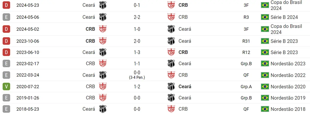 A última vitória do Ceará diante do CRB foi em 2020, pela Copa do Nordeste, por 2 a 1. De la pra cá, as equipes se encontraram por Copa do Nordeste (2022 e 2023), Série B (2023 e 2024), dois da Copa do Brasil (2024).