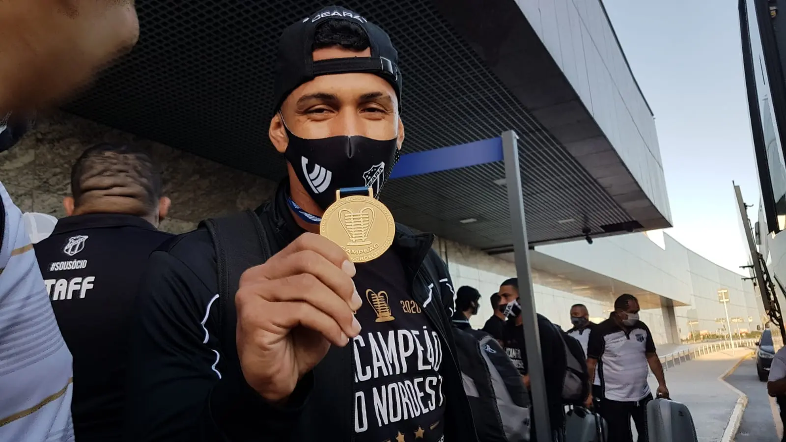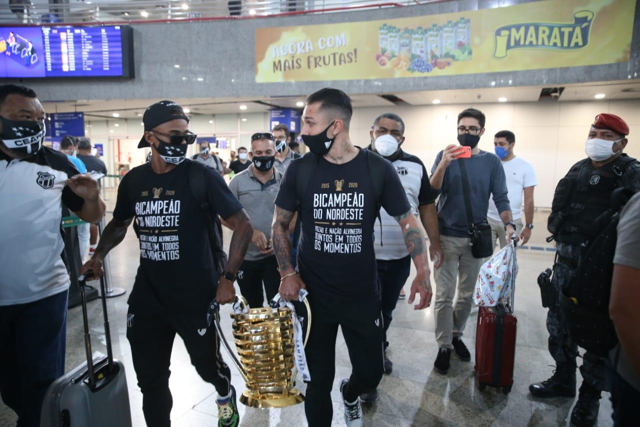 Jogadores desembarcaram carregando a "orelhuda", a taça de campeão do Nordeste, em chegada tranquila por esquema de segurança para evitar aglomerações de torcedores
