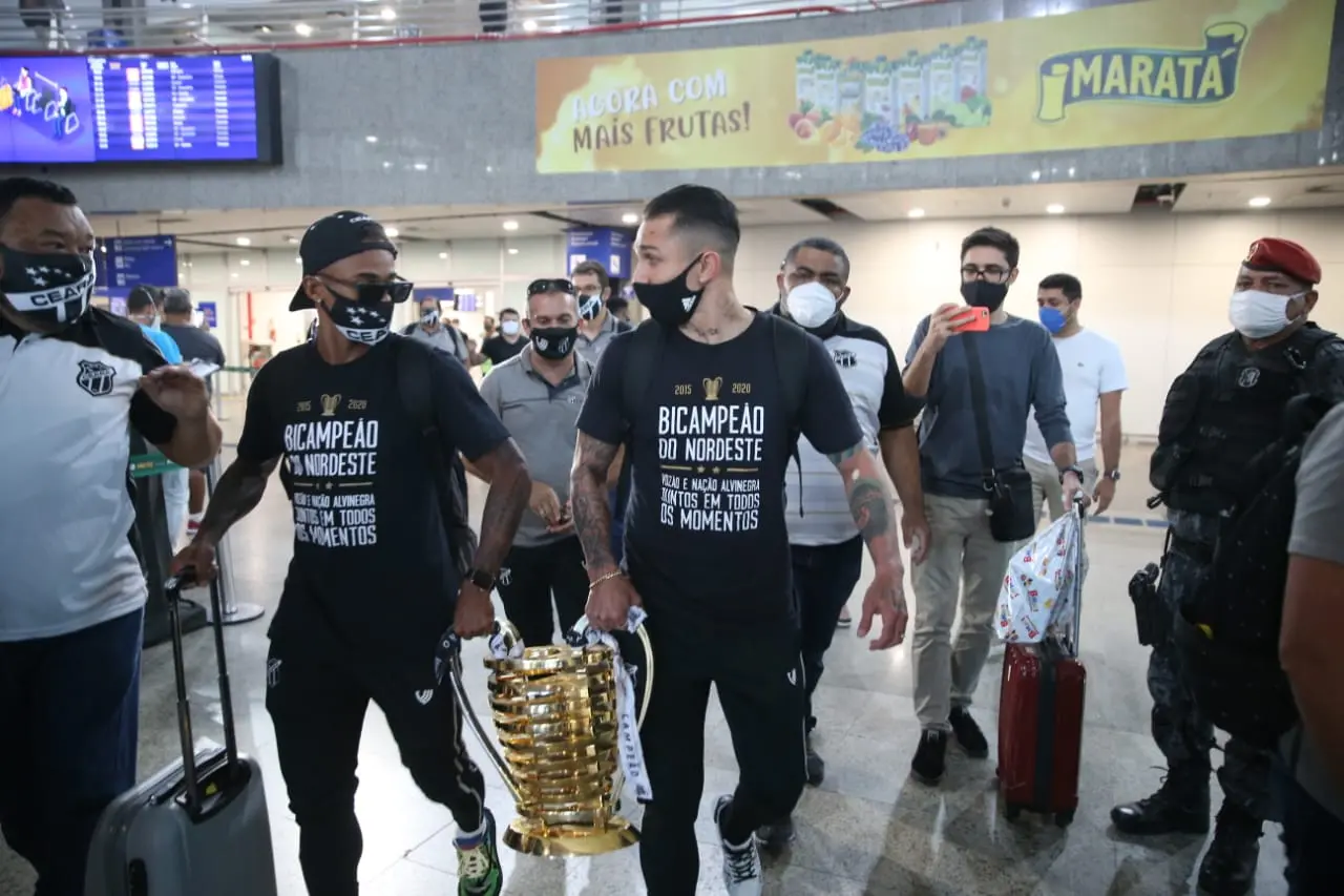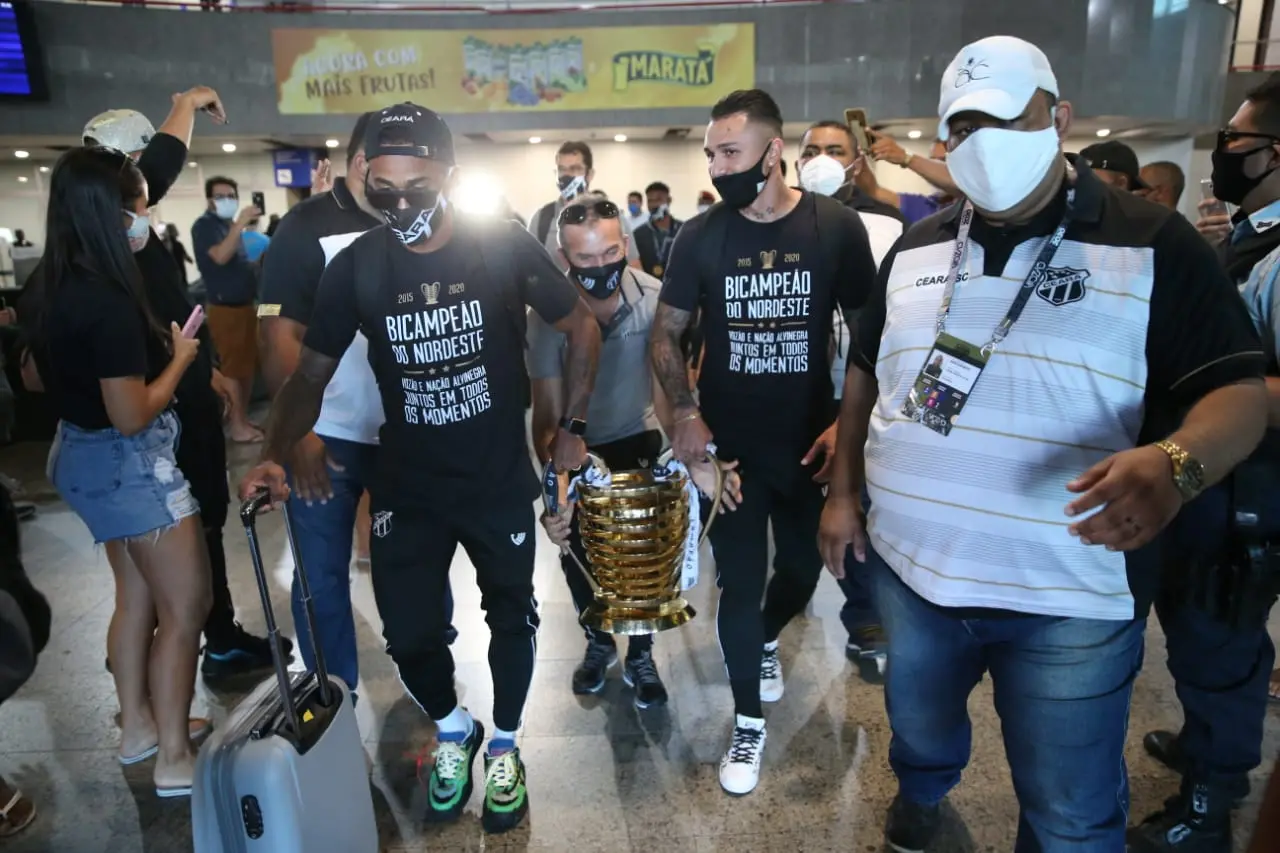 O Ceará desembarcou agora à pouco no Aeroporto Internacional de Fortaleza, após conquistar ontem de forma invicta a Copa do Nordeste em Salvador (BA). E os jogadores do Vovô, orgulhosos da conquista, desembarcaram com a taça na mão, a carregando, com Vinícius e Matheus Gonçalves.