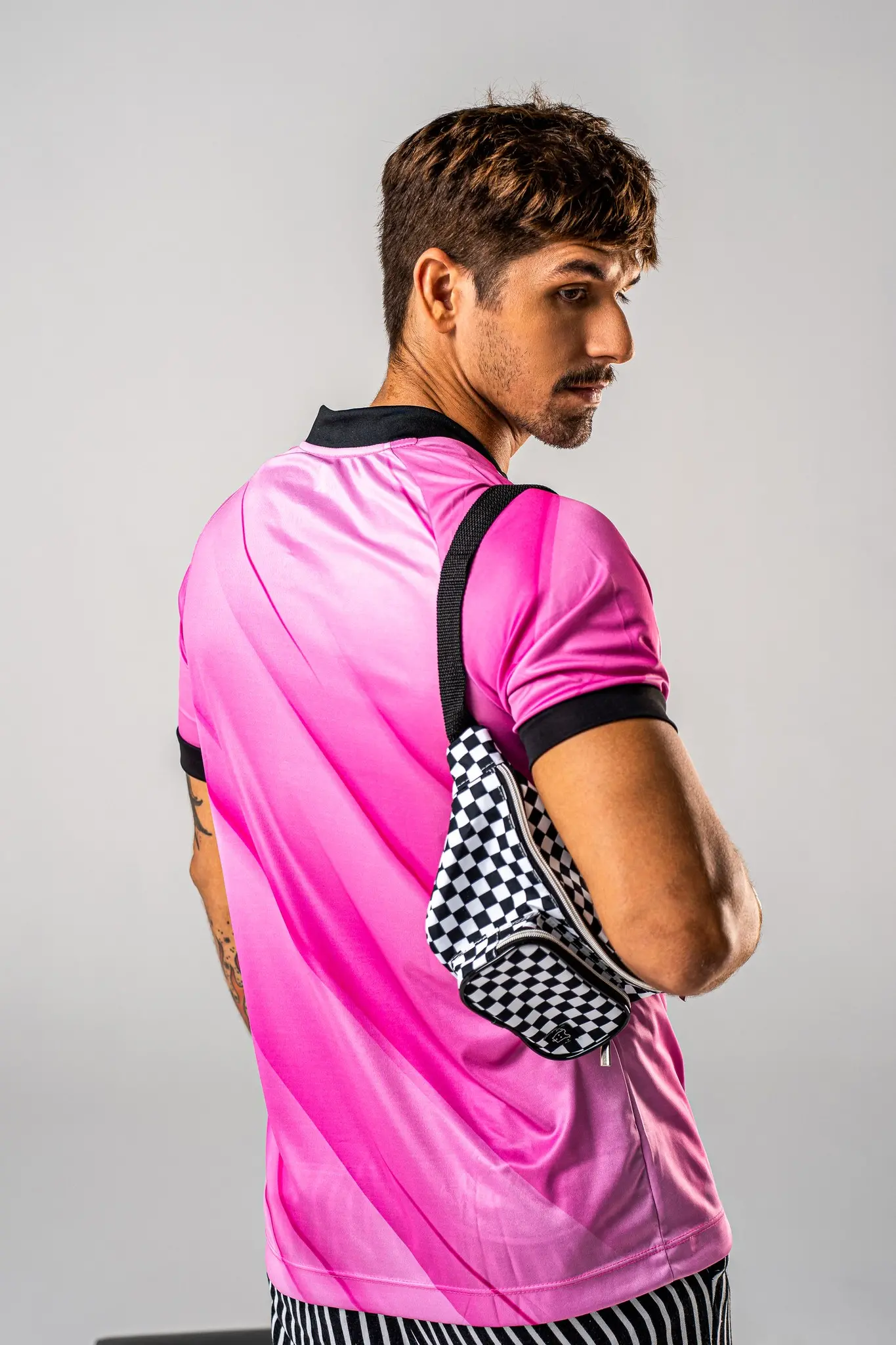 A camisa tem cor rosa, com detalhes pretos na gola e nas mangas, além de listras suaves