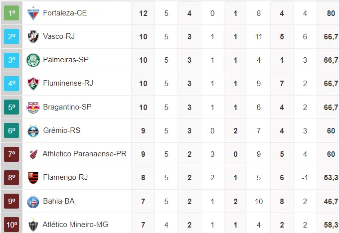 Em 5 jogos, são 4 vitórias e apenas uma derrota, com 80% de aproveitamento. São 8 gols marcados e 4 sofridos. O Fortaleza venceu o Internacional (1x0, no Beira-Rio), Coritiba (3x1, no PV), Corinthians (2x1, no Castelão), e São Paulo (2x1 no Morumbi), perdendo apenas para o Fluminense (1x0, em Volta Redonda).