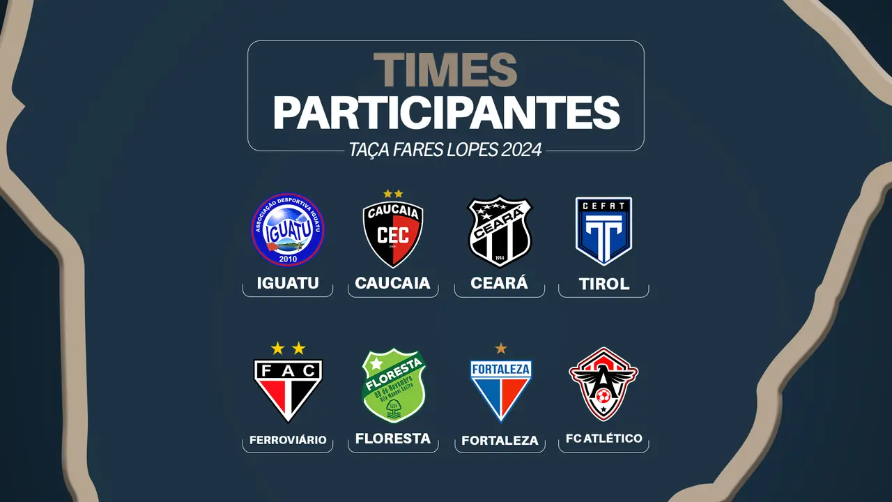 Estão definidos os 8 times que jogarão a Taça Fares Lopes de 2024. Iguatu (campeão de 2023), Caucaia, Ceará, Tirol, Ferroviário, Floresta, Fortaleza e Atlético disputarão a competição que dá a 3ª vaga na Copa do Brasil 2025 para o futebol cearense.