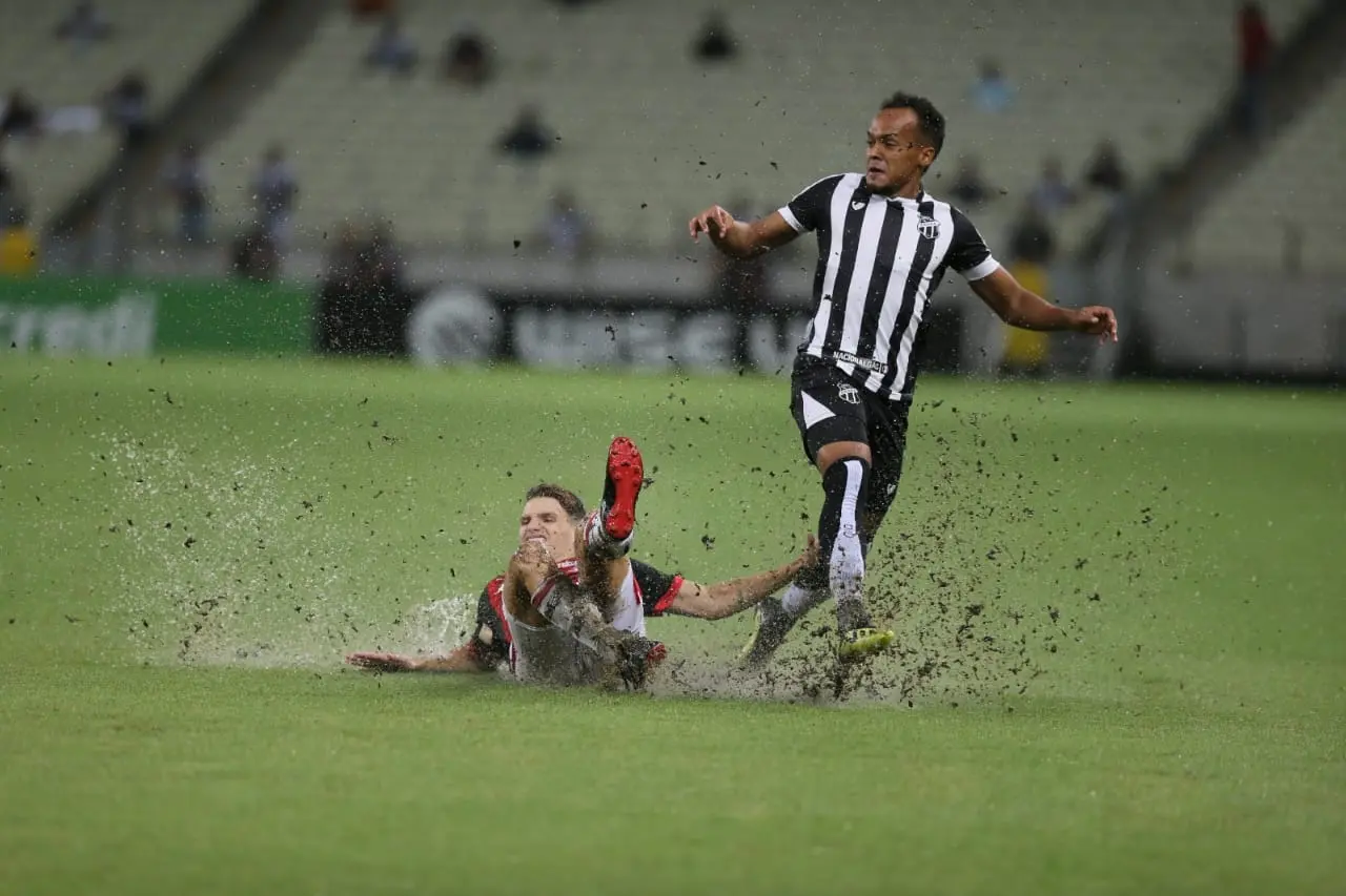 Em uma Arena Castelão encharcada pela chuva, o Ceará conseguiu se impor tecnicamente e dominou as ações da partida desde o início. Até os 10 primeiros minutos, o Vovô havia finalizado cinco vezes, seja de longa distância ou com infiltrações dentro da área.