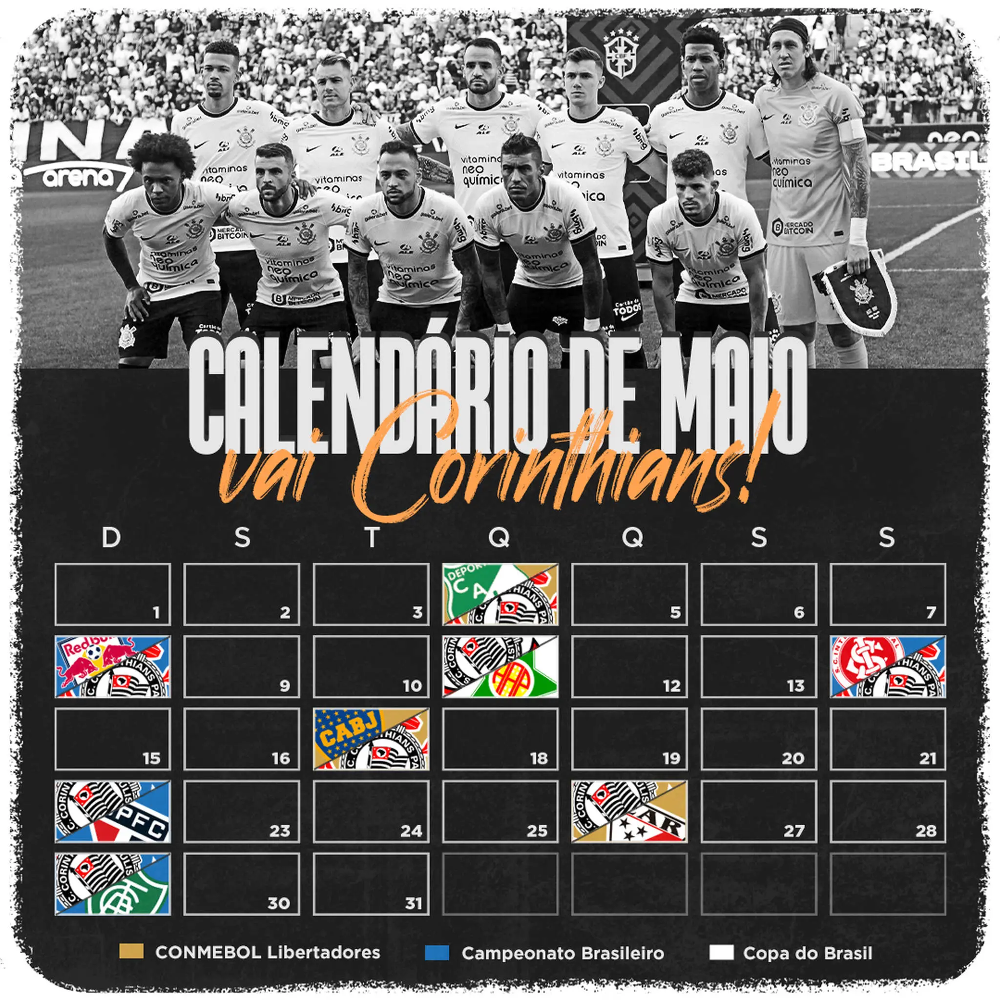 O mês de maio será decisivo para o Corinthians. A equipe entrará em campo por três competições diferentes: Série A do Brasileirão, Copa do Brasil e Libertadores da América.