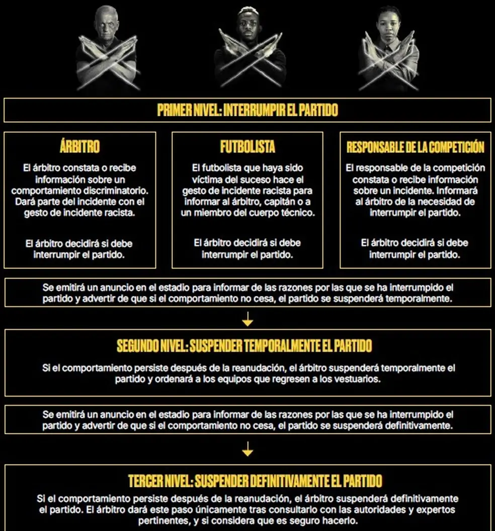 Segundo a entidade, o gesto de cruzar os braços faz parte do mecanismo que prevê ainda o procedimento em chamados três níveis, a depender da decisão do árbitro principal da partida: