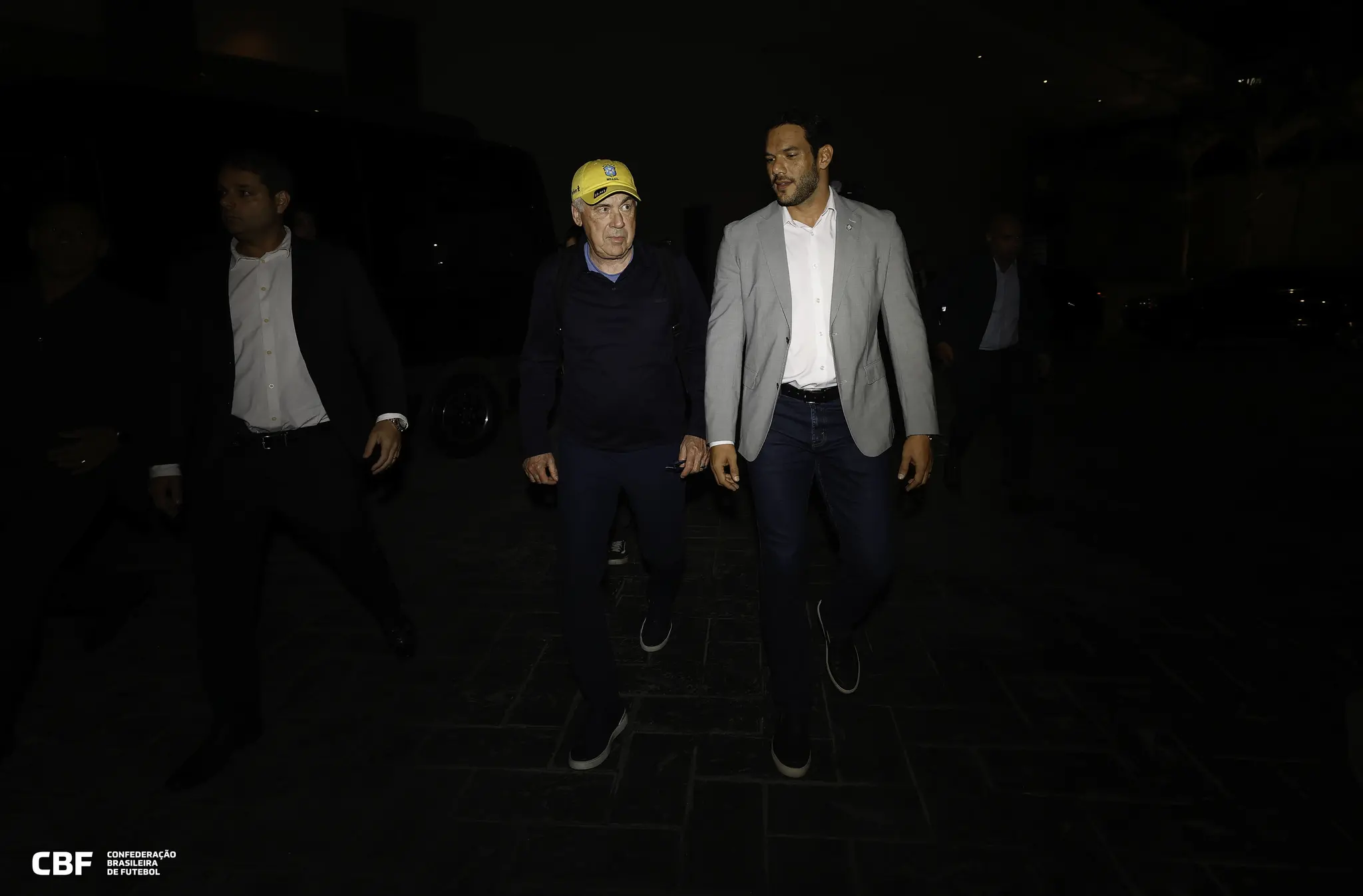 Após deixar o aeroporto, Carlo Ancelotti encontrou com Samir Xaud, presidente da CBF, e com Rodrigo Caetano, coordenador de seleções masculinas. Imagens flagraram conversas animadas entre eles, inclusive sobre a adaptação do italiano à língua portuguesa.