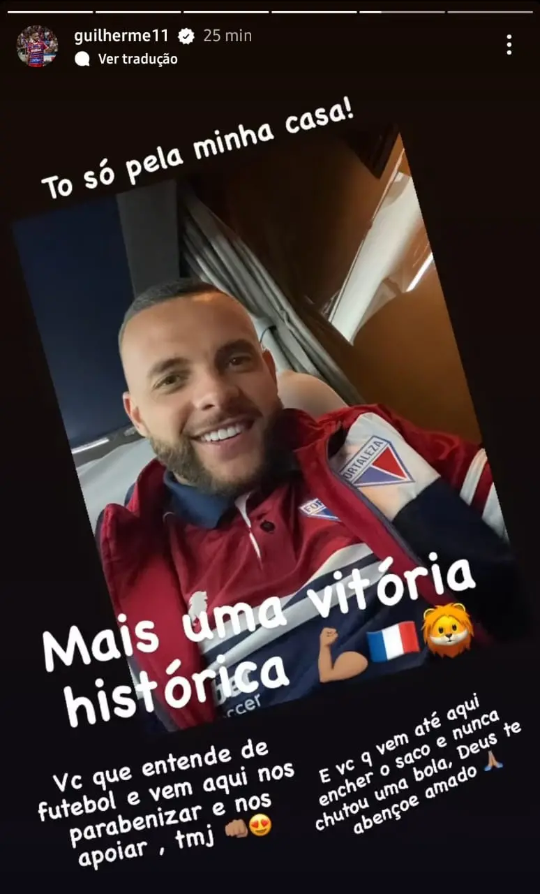 Recuperado de uma concussão cerebral e titular na vitória contra o Cruzeiro, o atacante Guilherme, do Fortaleza, utilizou as redes sociais para desabafar com os seguidores após o jogo da última quarta-feira, (21). A mensagem escrita pelo jogador era direcionada para quem o apoia e para seus críticos. A publicação foi apagada minutos depois.