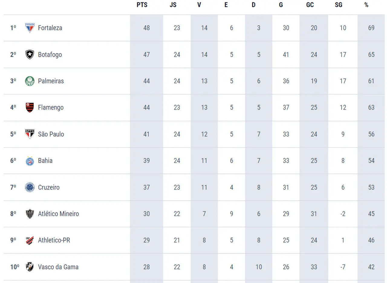 Veja os 10 primeiros da Série A após 24 rodadas