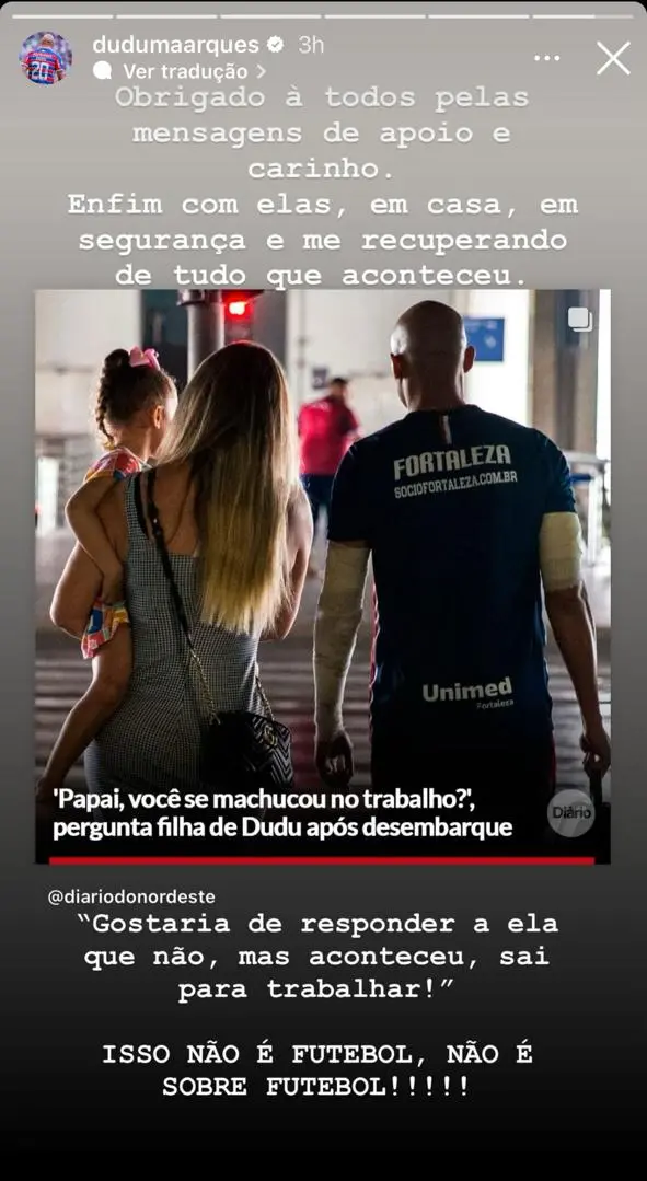 O lateral-direito Dudu comentou vídeo publicado pelo Diário do Nordeste registrando o reencontro com sua família - a esposa Carol e a filha Bella - na manhã desta quinta-feira, ao retornar de Recife, onde o ônibus do Fortaleza foi atacado com bombas e pedras por uma torcida organizada do Sport.