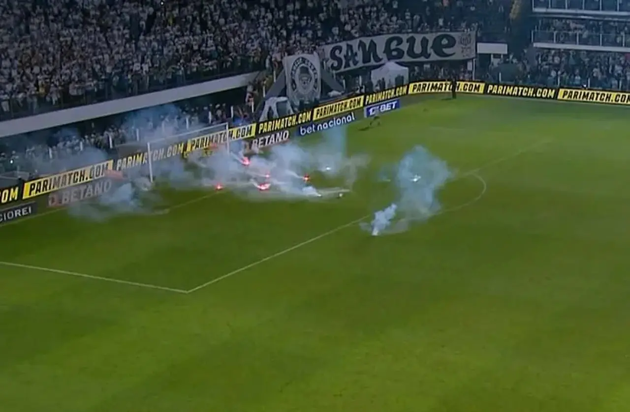 Quem não está aliviada é a torcida do Santos, que fez o árbitro Leandro Pedro Vuaden terminar o jogo antes do previsto, aos 44 minutos, depois que eles atiraram bombas em direção ao gramado que quase atingiram o goleiro Cássio. O jogo foi paralisado por dois minutos e, depois, encerrado. Seguranças tiveram de formar um cordão de isolamento no centro do gramado, onde os jogadores santistas se protegeram.