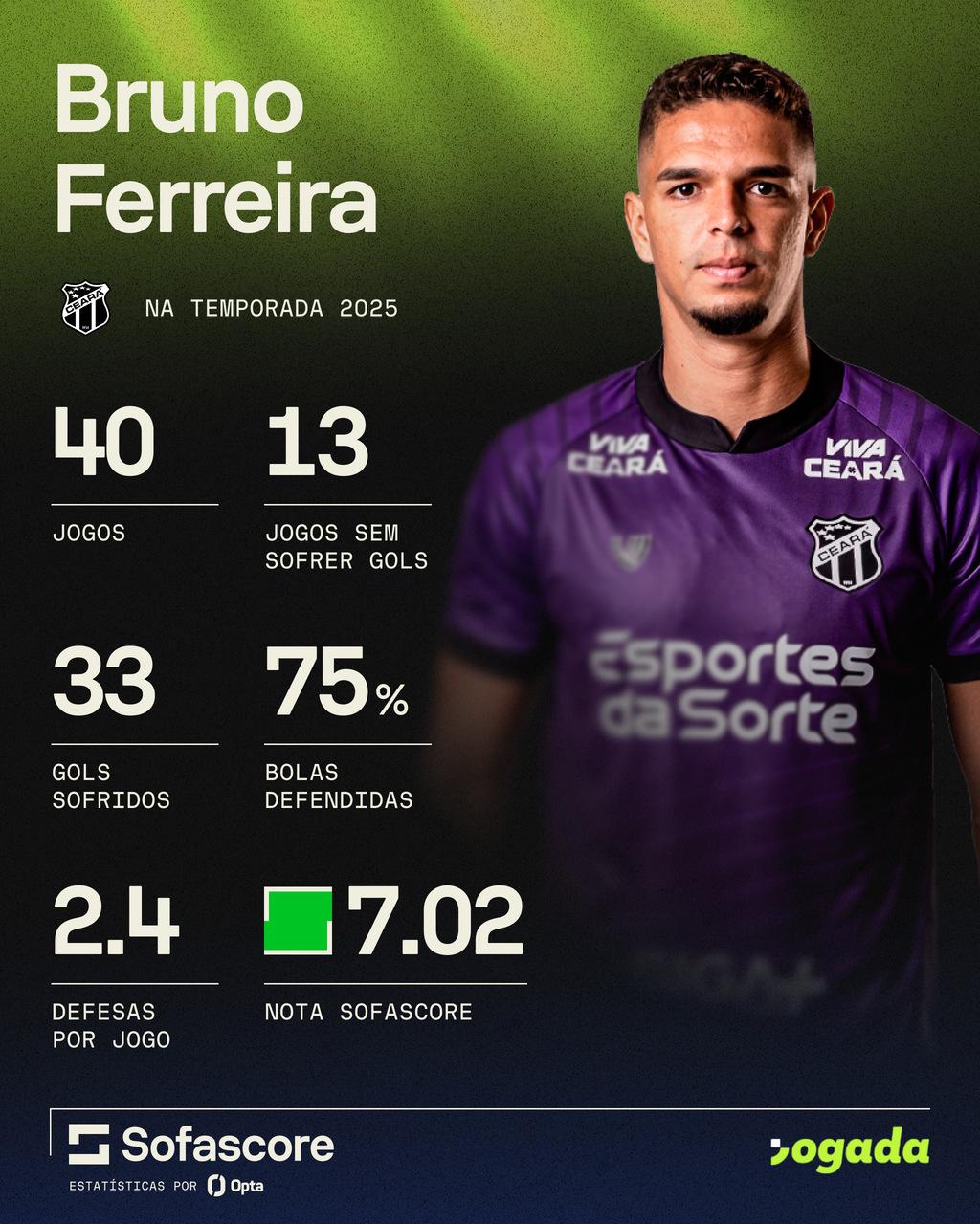 De acordo com os números do Sofascore, Bruno Ferreira tem 2,4 defesas por jogo. Ele fez 40 jogos na temporada e 25 na Série A.