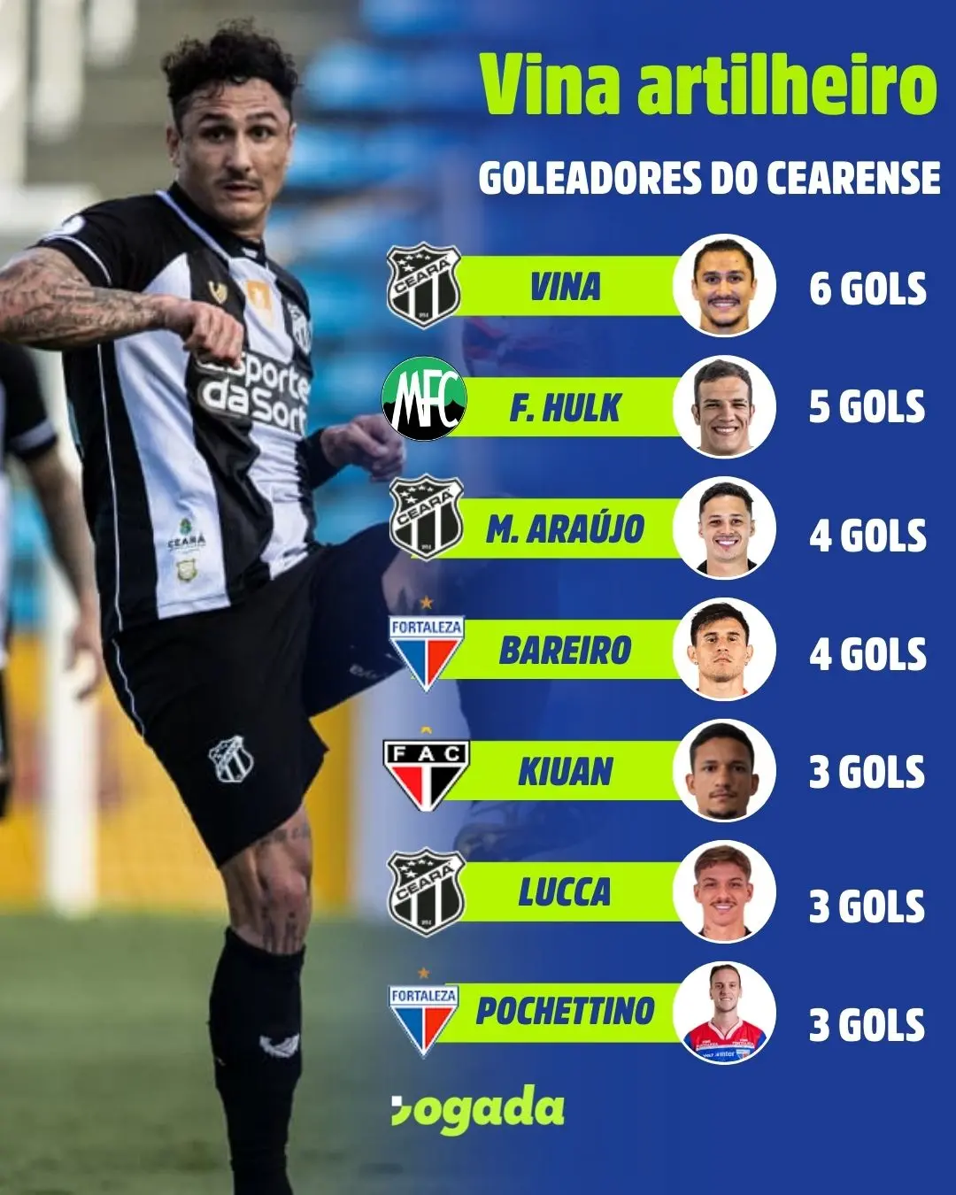 Embora contestado, Vina foi o artilheiro do Campeonato Cearense 2026; veja lista de goleadores