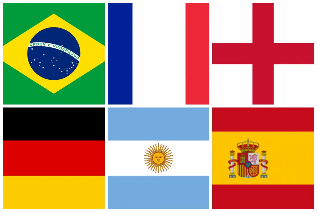 Das 32 seleções, 7 já foram campeãs do mundo: Brasil (5X), Alemanha (4x), França (2x), Argentina (2x), Uruguai (2x), Inglaterra (1x), Espanha (1x).