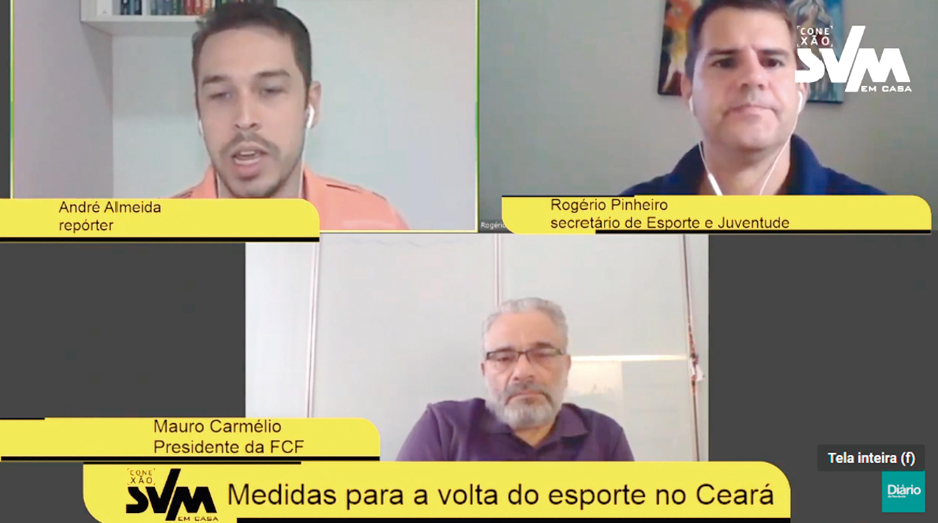 Ontem, Rogério Pinheiro, Secretário de Esporte e Juventude do Estado do Ceará (Sejuv), e Mauro Carmélio, presidente da Federação Cearense de Futebol (FCF), embora ainda cuidadosos, falaram sobre o assunto em entrevista ao programa "Conexão SVM em Casa", do Sistema Verdes Mares.