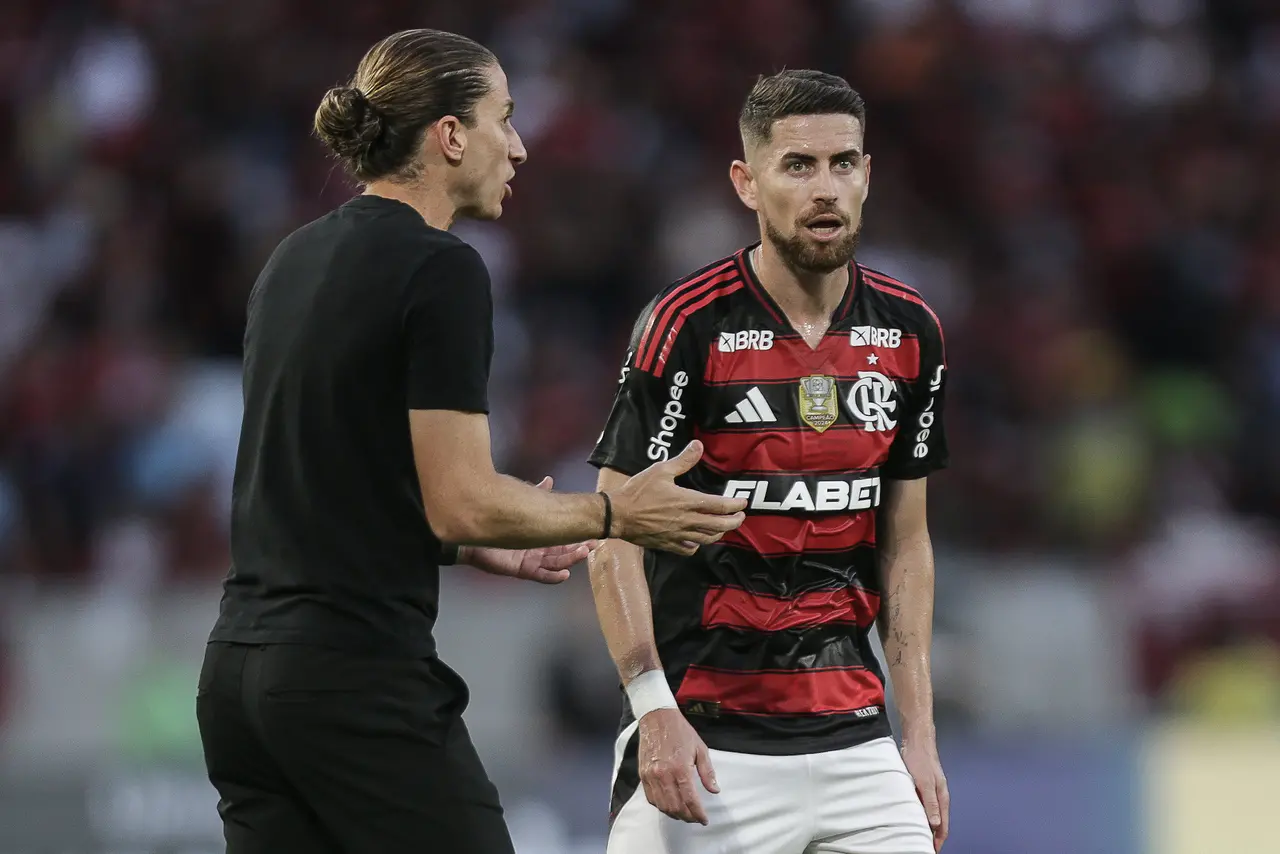 O técnico Filipe Luis orienta o volante Jorginho em partida do Fla