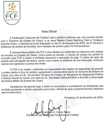 Ainda na nota, a Federação reforçou que o mando de jogo é dela - e não mais do Ceará - e que o plano de ação da partida será divulgado em breve, como a carga de ingressos, os valores e pontos de venda.