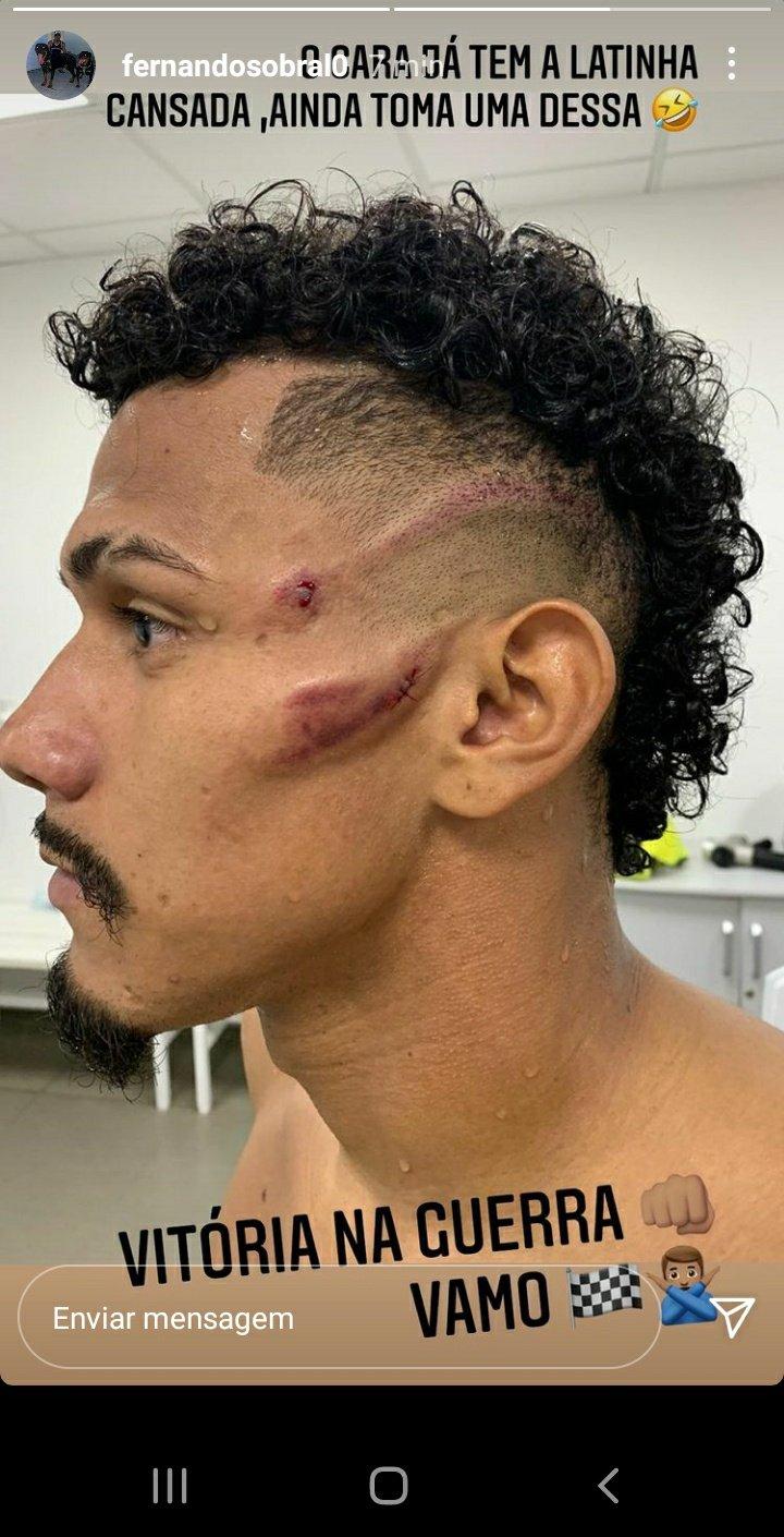 O volante Fernando Sobral, do Ceará, utilizou as redes sociais para mostrar o rosto machucado após a vitória no Clássico-Rei deste domingo (20). Brincando com a ferida, publicou 'vitória na raça'. A lesão ocorreu quando o meia Juninho, do Fortaleza, dividiu bola no alto e acertou a chuteira no rosto do alvinegro.
