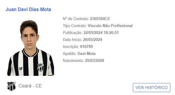 O atacante Juan Davi Dias Mota, de 15 anos, filho de Mota, ídolo da torcida do Ceará, teve seu primeiro registro no BID da CBF com a camisa alvinegra. Ele foi registrado na última segunda-feira (20), com vínculo não-profissional, já que faz parte das categorias da base, do elenco Sub-15 do Vozão.