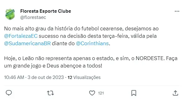 O Floresta desejou, através das redes sociais, sucesso ao Fortaleza na decisão dessa terça-feira (3) e ressaltou que o Leão, diante do Corinthians, em jogo válido pela segunda partida da semifinal da Sul-Americana, vai representar o Nordeste e encerrou a mensagem desejando um grande jogo aos tricolores.
