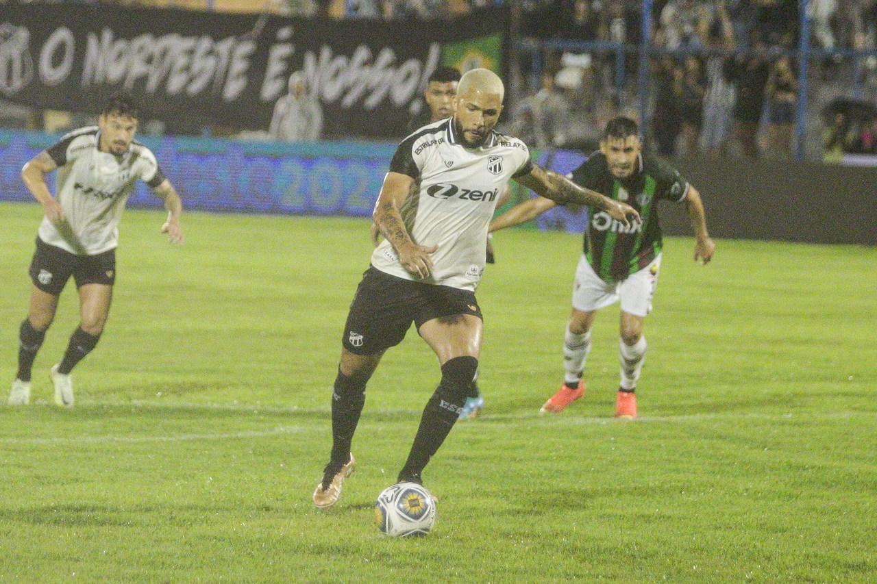 Foi quando aos 20 minutos, Vitor Gabriel fez grande jogada individual e foi derrubado na área: pênalti marcado e gol do centroavante do Ceará.