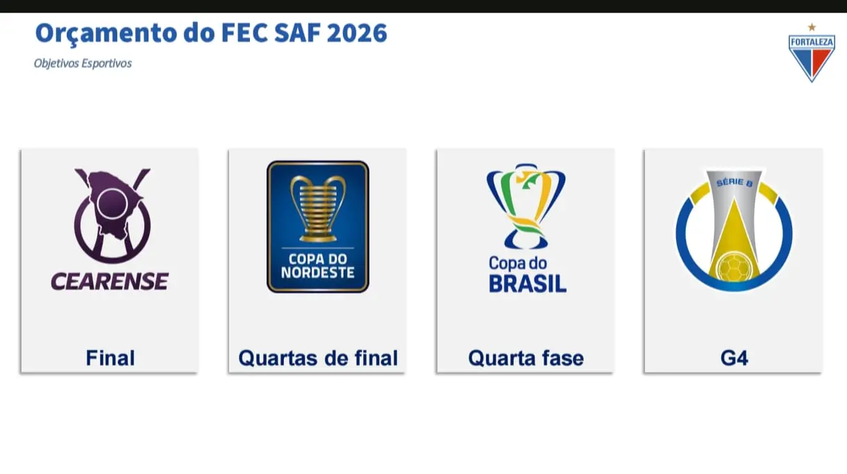 O Fortaleza definiu suas metas esportivas para a temporada 2026 nas quatro competições que disputará ao longo do ano. Os objetivos constam no orçamento oficial aprovado pelo Conselho Deliberativo no último dia 30.