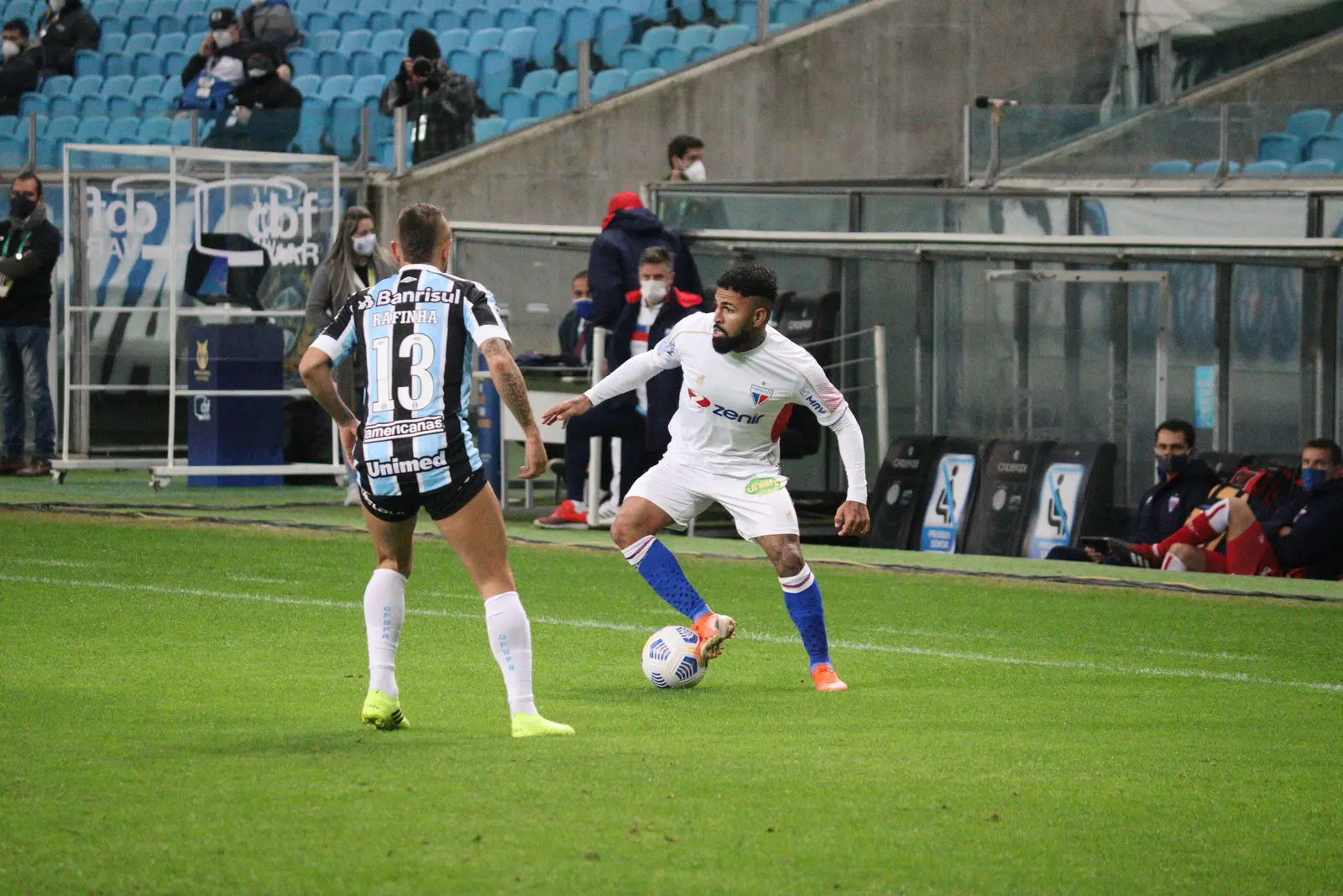 O Fortaleza parecia ter sentido o clima frio de Porto Alegre e não conseguia impor o estilo de jogo baseado na pressão alta e de domínio da posse de bola, como deseja o técnico Juan Pablo Vojvoda.