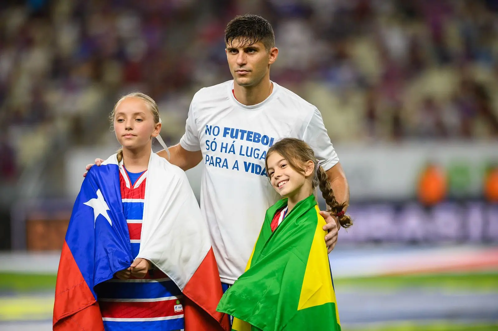 Além disso, o zagueiro chileno Kuscevic também ficou próximo de duas crianças que estavam com bandeiras do Brasil e do Chile, além dos números 13 e 17, em uma referência às idades das vítimas.