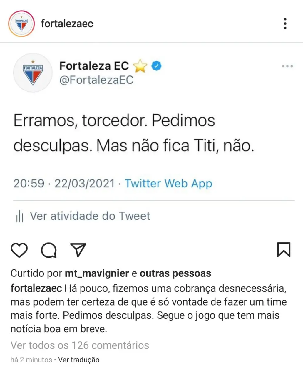 No entanto, ao ver a repercussão negativa junto aos tricolores, apagou o post e pediu desculpas em outro para que que ela não ficasse 'Titi', em alusão ao zagueiro que estava no futebol turco e negociava com o Leão.