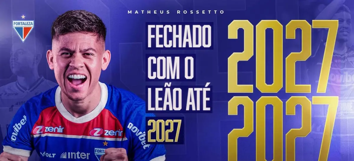 O Fortaleza anunciou através das suas redes sociais a renovação com Matheus Rossetto. O meio-campista tinha contrato com o Leão até o fim de 2026 e agora fica até 2027, com opção de renovação por mais um ano.