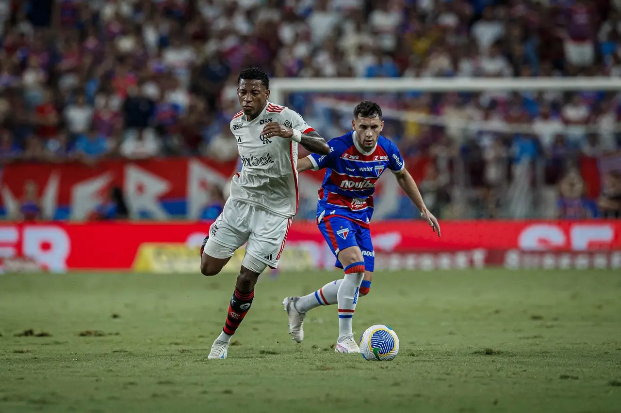 Diante de mais de 57 mil pessoas na Arena Castelão, Fortaleza e Flamengo empataram em 0 a 0 na noite desta terça-feira (26), em jogo da 35ª rodada da Série A. O Leão ficou com um jogador a mais desde os 25 minutos do 2º tempo com a expulsão de Erick Pulgar, mas não conseguiu passar pela defesa do time carioca. Com o resultado, o Tricolor se distanciou do sonho do título brasileiro. No entanto, a equipe comandada por Juan Pablo Vojvoda segue invicta em casa e na briga pela vaga na fase de grupos da Libertadores.