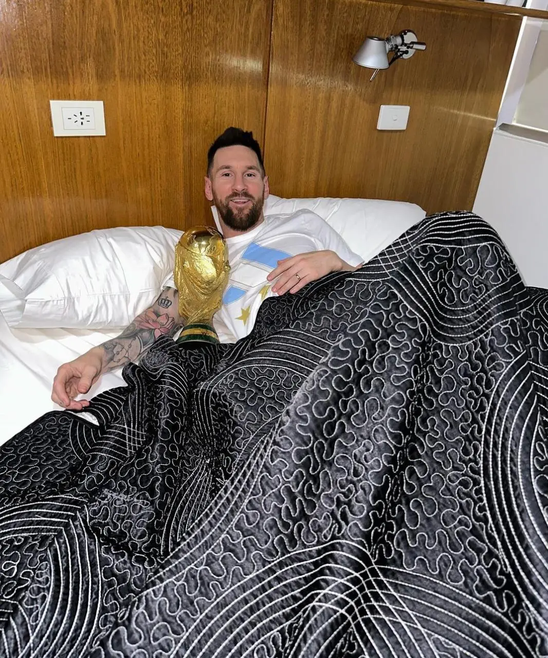 Craque da Argentina na Copa do Mundo de 2022, Messi fez questão de registrar o momento de descanso logo após chegar ao país natal, nesta terça-feira (20). Deitado na cama, o camisa 10 publicou imagens abraçado com a taça conquistada no Catar.