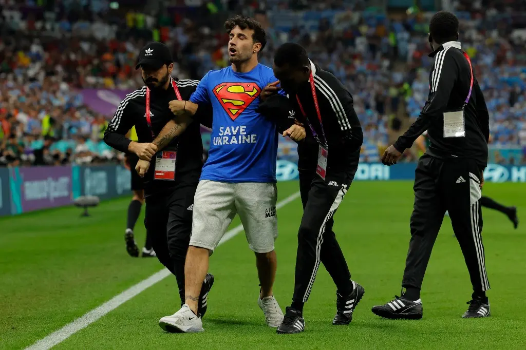 O torcedor que invadiu o gramado na vitória de Portugual por 2 a 0 sobre o Uruguai, teve seus documentos confiscados e está proibido de assistir outras partidas. O italiano Mario Ferri entrou com bandeira LGBTQIA+, além de camisa em solidariedade à Ucrânia e mulheres iranianas.