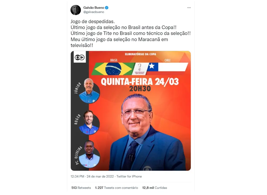 Galvão Bueno chamou atenção das redes sociais, na tarde desta quinta-feira (24). Em postagem no Twitter, ele escreveu mensagem em tom de despedida sobre a narração esportiva, às 20h30, entre Brasil e Chile — jogo das eliminatórias da copa.