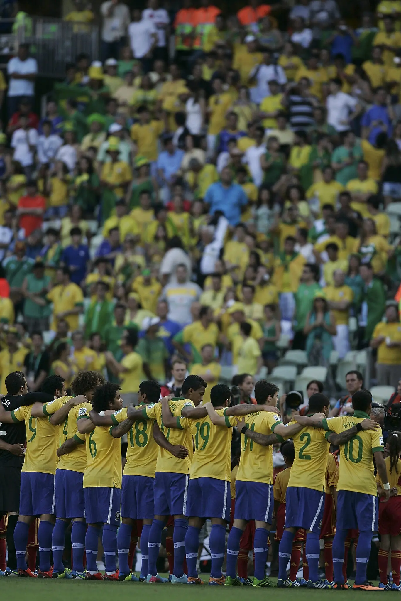 Antes mesmo da bola rolar, a torcida presente na Arena Castelão para acompanhar a partida deixou claro que apoio não iria faltar. A plenos pulmões, os torcedores entoaram parte do Hino Nacional Brasileiro à capela, em uma das cenas mais marcantes da história recente da Seleção Brasileira e que passou a se repetir nos jogos seguintes.