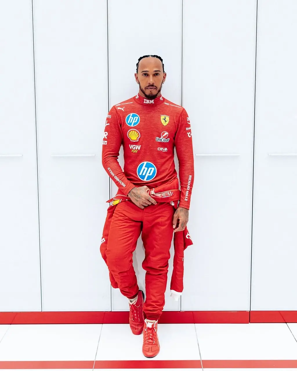 Um dia depois de realizar a primeira atividade como piloto da Ferrari, nesta terça-feira Lewis Hamilton apareceu pela primeira vez ao público com o macacão da escuderia italiana. O britânico e a Ferrari publicaram em seus perfis no Instagram a imagem, com a seguinte legenda: "First time in red" (primeira vez de vermelho).