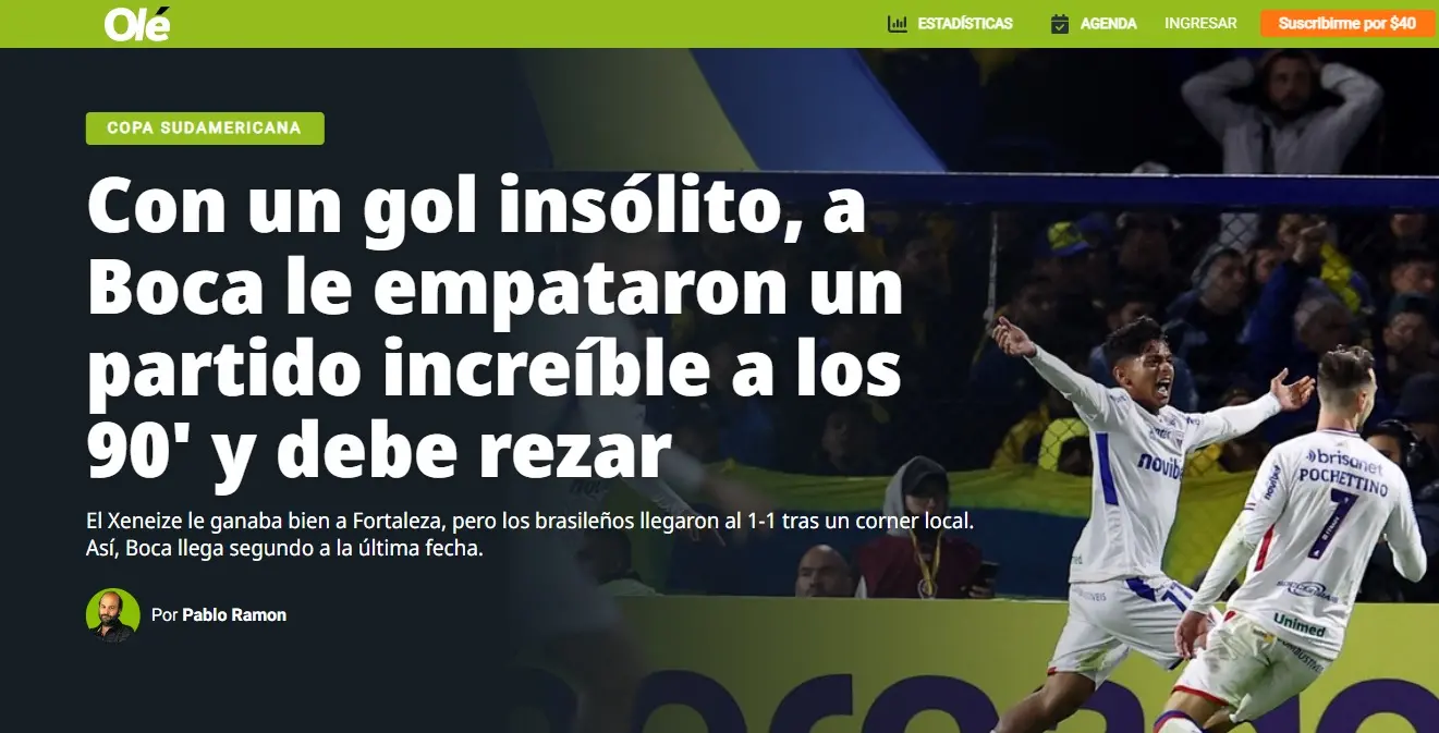 Um dos mais importantes meios de comunicação esportivos na Argentina, o Diário Olé lamentou o gol de empate do Fortaleza contra o Boca Juniors na noite desta quarta-feira (15). A partida terminou em 1 a 1 e complicou os 'xeneizes' na Copa Sul-Americana, que agora vê o Fortaleza muito próximo da liderança do grupo e passagem direta para oitavas.