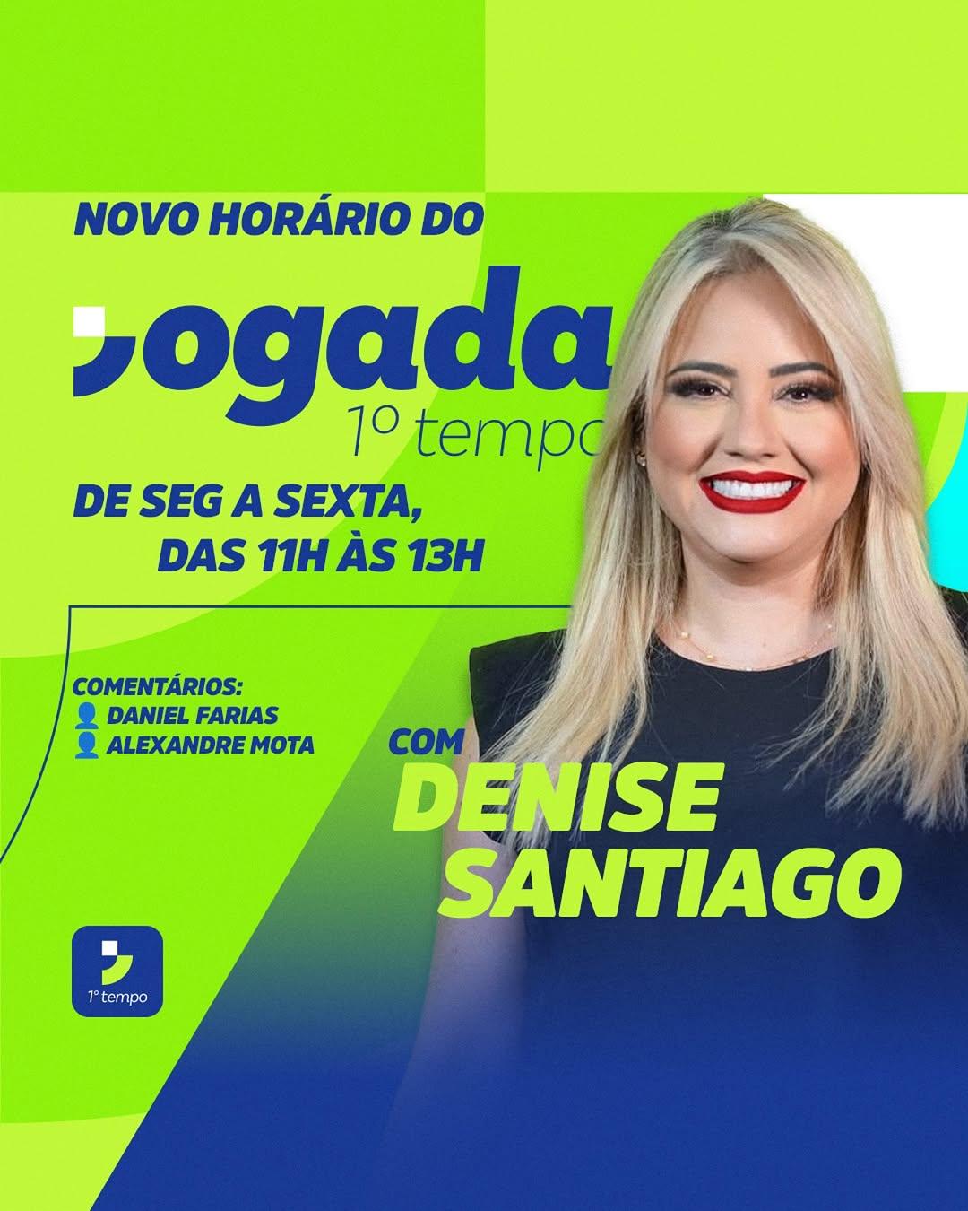 O programa Jogada 1º Tempo, apresentado por Denise Santiago, ganhará mais 30 minutos a partir da próxima segunda-feira (14) e passará a começar às 11h, de segunda a sexta-feira, com mais informação, debate e alegria para os torcedores.