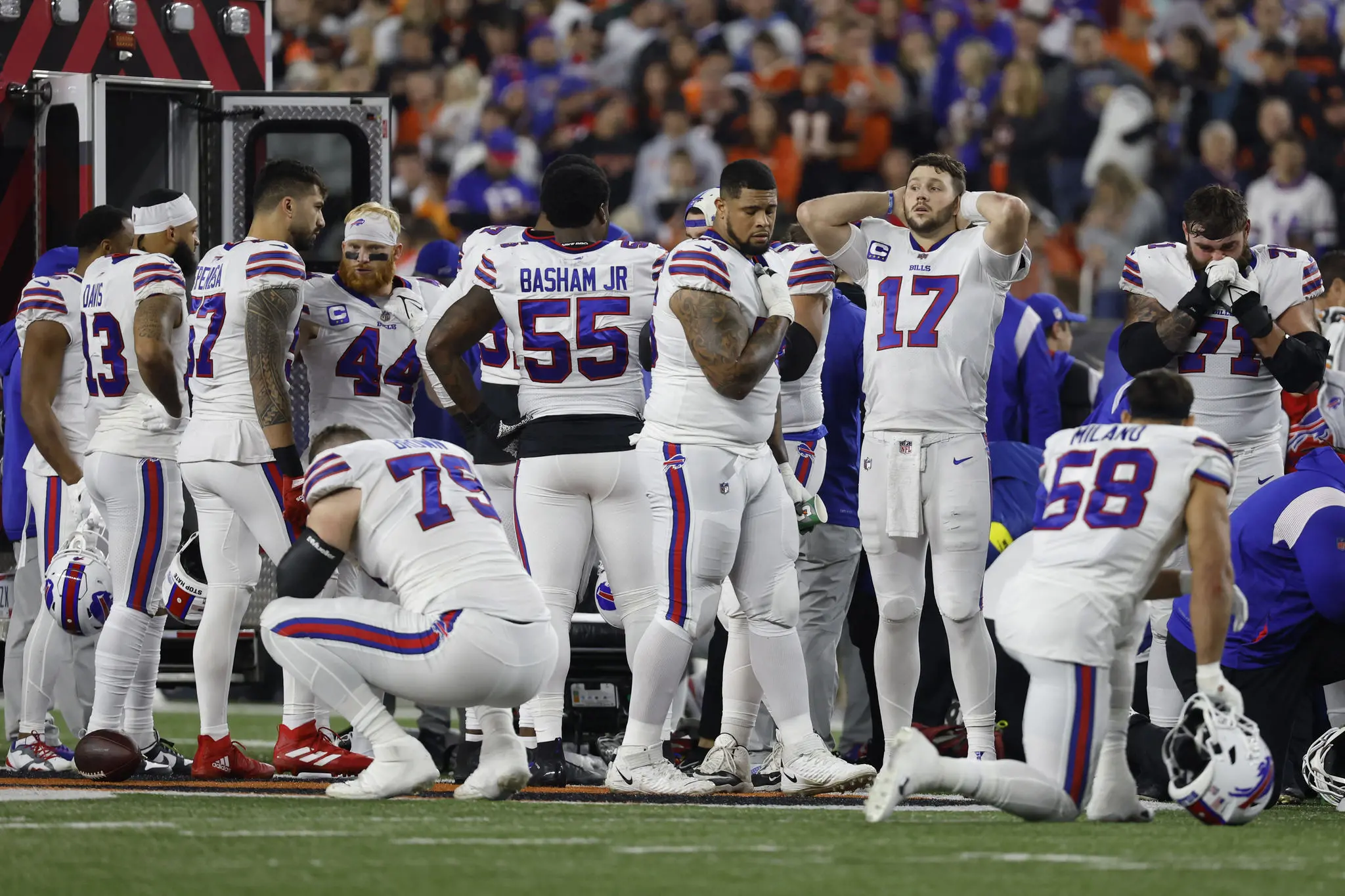 Após a suspensão da partida, jogadores do Buffalo Bills se reuniram no centro do gramado e realizaram uma oração pela melhora do companheiro de franquia. Nas redes sociais, o nome de Damar Hamlin ganhou destaque, com torcedores, fãs do esporte, jornalistas, franquias e atletas subindo correntes de oração e desejando melhoras ao safety.