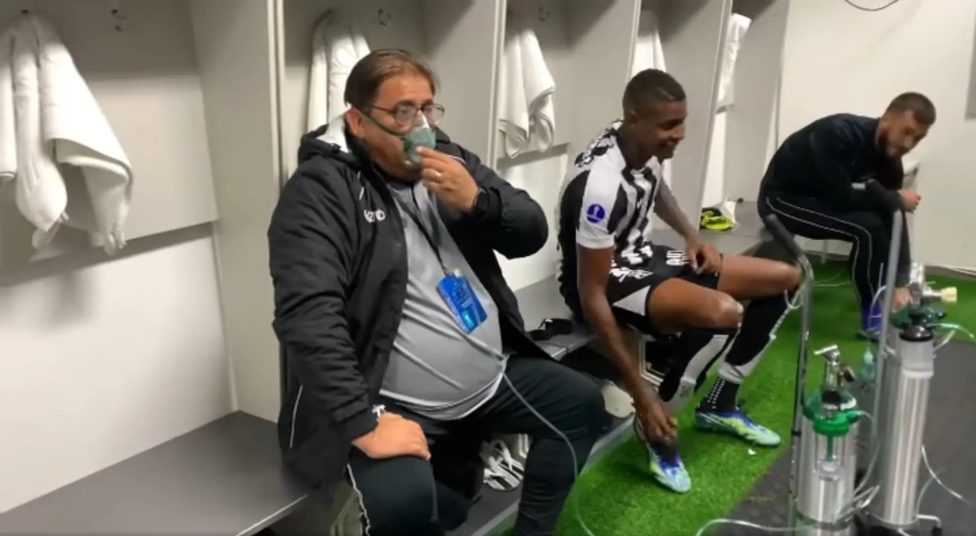 A cena acontecem nos vestiários após o jogo, de muito desgaste e entrega por parte dos jogadores alvinegros, que fizeram uma partida inteligente e souberam jogar na condição adversa